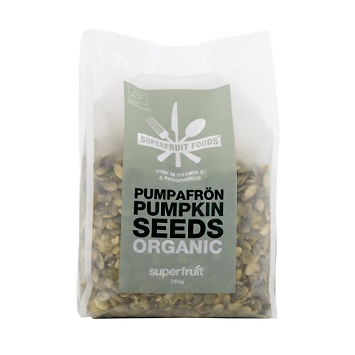 Superfruit Pumpafrön Pumpafrön är rika på fosfor och vitamin E och går att använda till väldigt mycket. Våra pumpafrön är ekologiskt odlade och av bästa kvalitet. Pumpafrön är naturligt rika på vitamin E som bidrar till att skydda cellerna mot oxidativ stress. Det är viktigt med en mångsidig och balanserad kost samt hälsosam livsstil. Använd pumpafrön till att göra musli, granola, glass, bakverk, rawfoodbollar eller bara ät dem som de är!