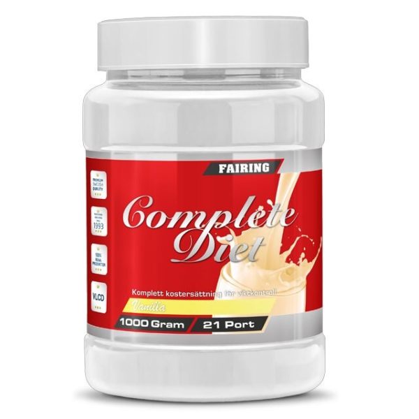 Gå ner i vikt med Complete Diet Complete Diet från Fairing är den kompletta måltidsersättningen för dig som vill gå ner i vikt och se snabba resultat! Complete Diet innehåller allt din kropp behöver under 1 dygn. Äter du tre portioner per dag betyder det att du tillgodoser alla kroppens behov av makro och mikronutrienter. Dietshake med lågt GI Genom Complete Diets låga energiinnehållet tappar du snabbt i vikt utan att ligga för lågt i protein, fett, kolhydrater, vitaminer och mineraler. Dieten har ett lågt GI (glykemiskt index) vilket gör att du håller insulinet i schack mellan måltider. Detta beror på att Fairing har valt att använda fruktos och palatinos som kolhydratkällor. Fördelar med Fairing Complete Diet Fiberrik och kvalitativ viktminskningsprodukt Förser kroppens alla behov Gå ner i vikt snabbt och hälsosamt Uppnå en hög grad av mättnadskänsla Anpassa själv till din diet Finns i flera goda smaker Palatinos för viktnedgång Palatinos är en variant på socker men har extremt lågt GI (glykemiskt index) och är dessutom vänlig mot tänderna. Complete Diet är även en låglaktosprodukt, vilket både är skonsamt för överkänsliga, men också för magen generellt som inte blir uppblåst eller svullen efter måltid. De största fettkällorna i Complete Diet är svensk rapsolja med en bra andel enkelt- och fleromättat fett samt MCT som tas upp snabbt i kroppen och inte lagras som underhudsfett. En hög grad av mättnadskänsla Andra källor i Complete Diet är bra fett från både kakao och havre. Andelen fiber är hög vilket gör att du får en högre och mer behaglig mättnadskänsla. VLCD-produkten (very low calorie diet) är framtagen av en näringsexpert och såklart godkänd av Livsmedelsverket. Anpassa din diet Med Complete Diet kan du själv anpassa din diet. Vill du inte leva enbart på dieten går det utmärkt att bara ta en portion som mellanmål eller måltidsersättning till mål du själv väljer. Complete Diet finns i flera goda och krämiga smaker.