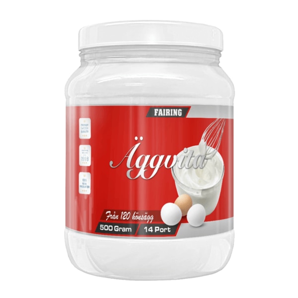 Stark proteinkälla Fairings Äggvita 500 gram är pastöriserad, torkad och pulvriserad äggvita från ca 120 hönsägg. När pulvret blandas med vatten återfås flytande äggvita, som med sin fullvärdiga aminosyraprofil är en av de bästa proteinkällorna. En förpackning Äggvita ger 4 liter konsumtionsfärdig äggvita. Fördelar med Fairing Äggvita Torkad äggvita från 120 hönsägg 80% protein, med högvärdig aminosyraprofil Tillsätt endast vatten Inget tillsatt fett Kalorisnål Använd till matlagning Fairing Äggvita är en kalorisnål produkt utan fett och kan användas till mycket inom matlagning. Stek till exempel och ät som högproteinvariant på vanligt stekt ägg, eller ha en skvätt i din frukostgröt, på dina pannkakor och bröd eller vispa upp till fluffiga gratängtäcken. Du kan även vispa Fairing Äggvita och använda i tårtbottnar, vänd då ner äggvitan i glassmeten för en extra volym och gör maränger att toppa med. Endast fantasin sätter gränser!