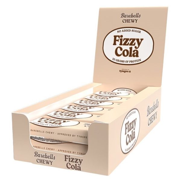 Godis från barebells! Barebells Chewy Bar Fizzy Cola tar snackvärlden till en helt ny dimension! Föreställ dig den ikoniska smaken av bubblande cola-godis – syrligt, sött och alldeles oemotståndligt. Nu i en härligt seg och fluffig bar, omsluten av ett krämigt lager av vit choklad, dessutom med 10g protein. En överraskande och lekfull smakupplevelse som påminner om din favoritläsk, fast i snackform! Liten i storlek men stor i smak – och självklart, precis som alltid, utan tillsatt socker och laddad med protein.