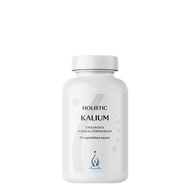 Holistics kapslar med kalium. Kalium finns bland annat i frukter, grönsaker, nötter, frön, mjölkprodukter och kött. Kalium bidrar till att bibehålla normalt blodtryck.