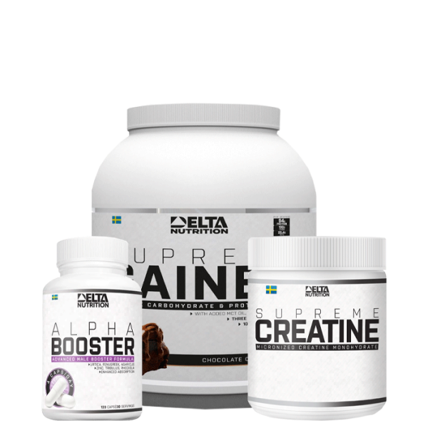 Delta Growth Pack innehåller Creatine, Gainer och Alpha Booster för att optimera din träning!