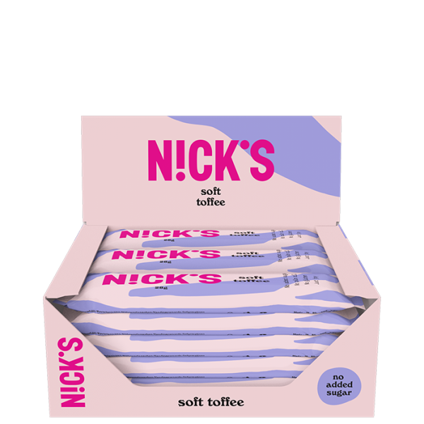 NICKS Bar Soft Toffee kommer i en chokladbar fylld med mjuk toffee och täckt av mjölkchoklad. Utan tillsatt socker, palmolja och gluten.