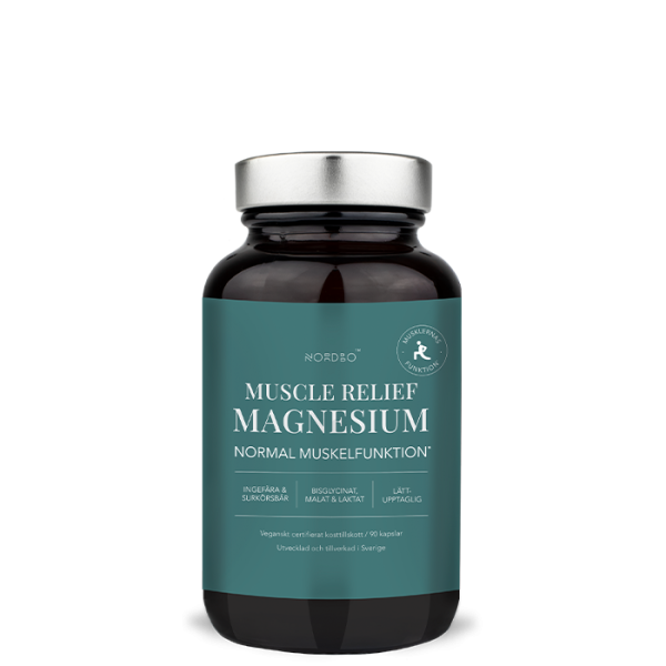 Muscle Relief Magnesium 90 kapslar, är ett kosttillskott från Nordbo framtaget för dig som tränar. Med tre olika former av magnesium i kombination med ingefära och surkörsbär.