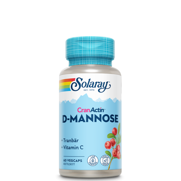 Mannose CranActin är ett kosttillskott från Solaray med 1 000 mg D-mannos, 400 mg tranbärsextrakt och 30 mg vitamin C per dosering. Vitamin C bidrar till immunförsvarets normala funktion.