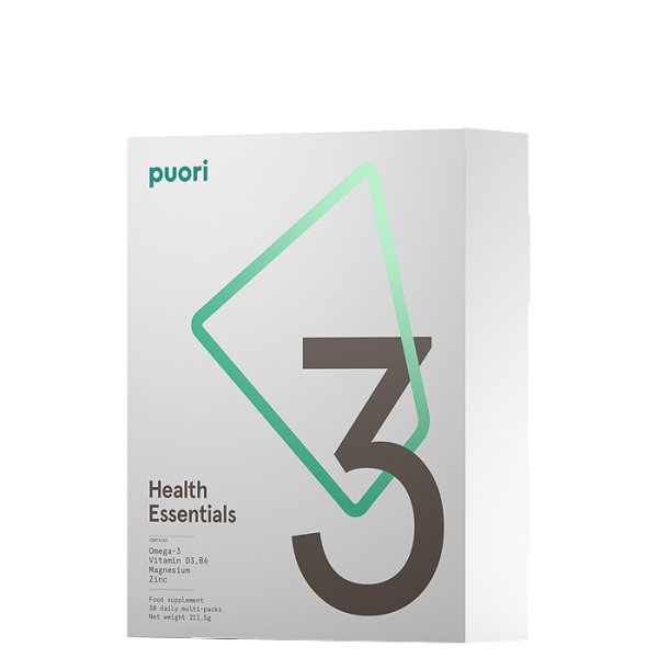 P3 från Puori kombinerar tre produkter i en. Denna produkt innehåller omega-3, magnesium, zink, vitamin B6 och D3 i separata kapslar förpackade i smidiga portionspåsar.