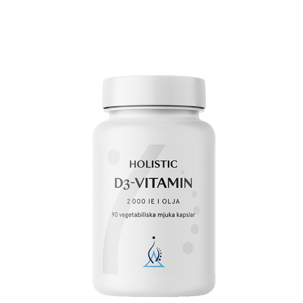 Holistic D3-vitamin, 2000 IE är ett D3-vitamintillskott som innehåller 2000 IE per kapsel. D-vitamin bidrar bland annat till att bibehålla en normal benstomme.