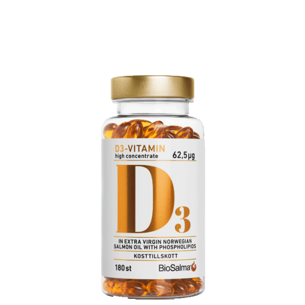 D3-vitamin High Concentrate är ett kosttillskott från BioSalma. Detta är laxolja tillsammans med en hög dos vitamin D förpackat i en liten kapsel.