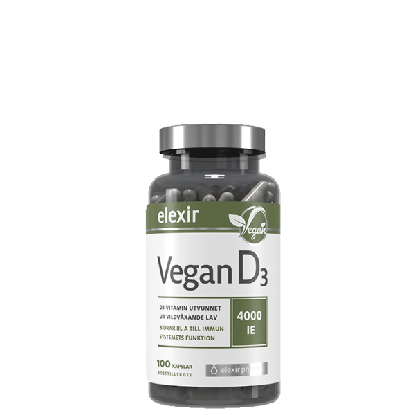 D3-vitamin vegan är ett kosttillskott från Elexir Pharma med vegansk vitamin D3 från lav. Ger 100 μg vitamin D per kapsel. En förpackning räcker i 100 dagar.