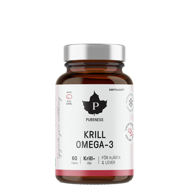 Omega-3 från krill håller en hög kvalitét. Pureness känner till detta och har därför tagit fram Krill Omega-3 där oljan enbart kommer från hållbart fiske med komplett spårbarhet. Den dagliga dosen är två kapslar som tillsammans ger totalt 318 mg omega-3.