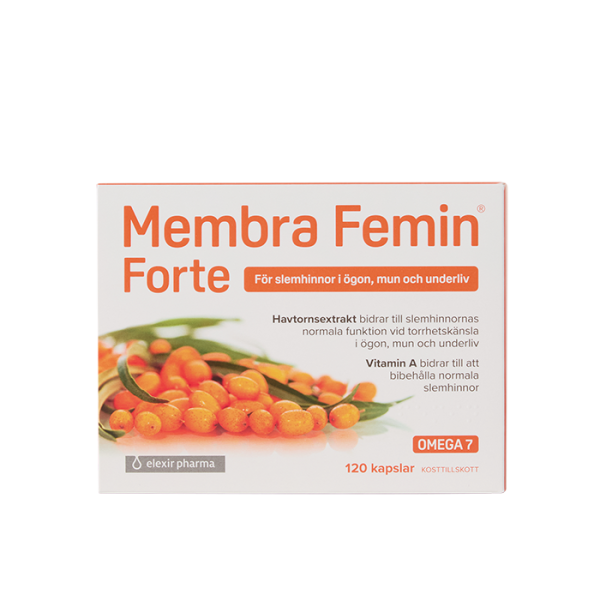 Membra Femin Forte är ett kosttillskott från Elexir Pharma med innehåll av viltväxande havtornsbär samt vitamin A, som bidrar till och slemhinnornas normala funktion.