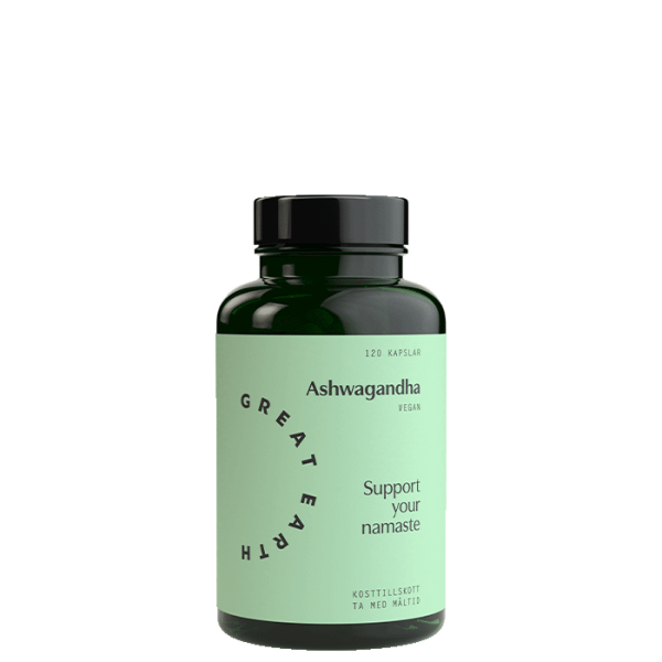 Ashwagandha är ett kosttillskott från Great Earth. Med 600 mg ashwagandhaextrakt och 15 mg withanolider per daglig dos. En vegansk produkt med delbara kapslar.