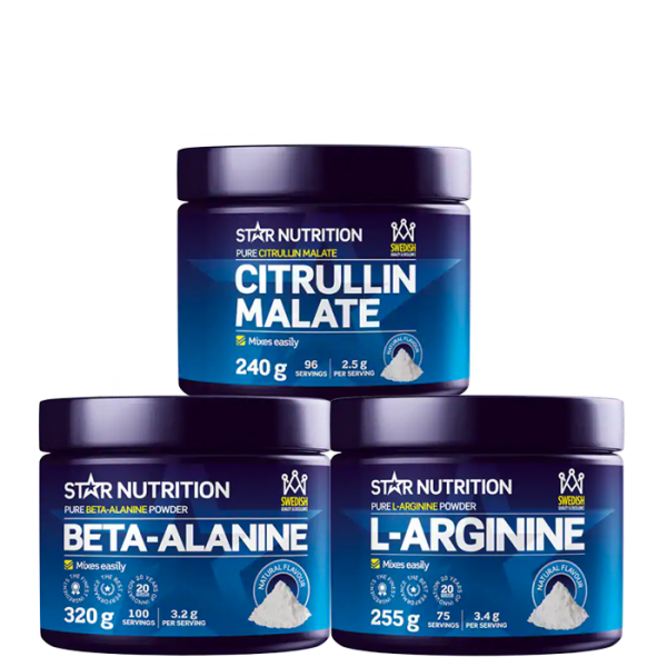 Pump Paket: Citrullinmalat + L-arginin + Beta-alanin hittar du i Aminosyror, Färdiga paket, PWO - Prestationshöjare och är taggad med Alanin, Arginin, Beta-Alanin.