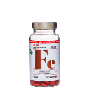 Järn med C-vitamin är ett kosttillskott från Elexir Pharma som kombinerar järn med vitamin C som bidrar till att öka upptaget av järn. Endast en tablett om dagen behövs.