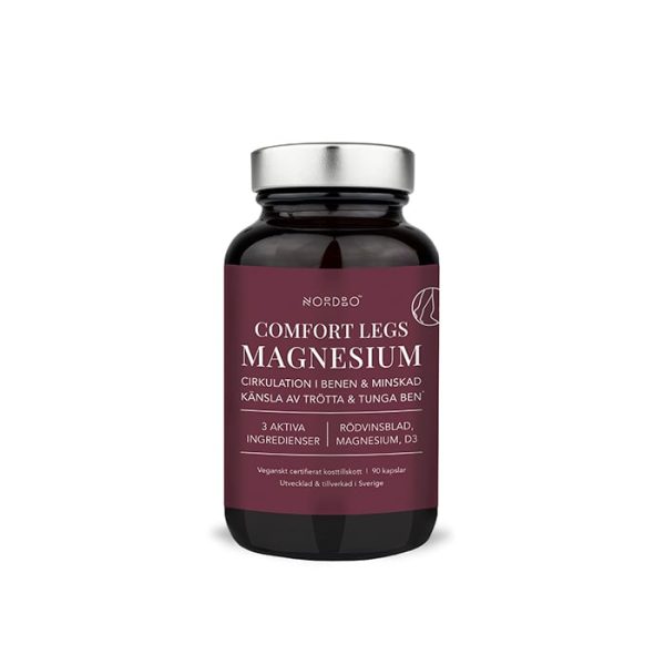 Comfort Legs Magnesium 90 kapslar, är ett kosttillskott från Nordbo som kombinerar två former av magnesium med vegansk D3 och rödvinsblad.