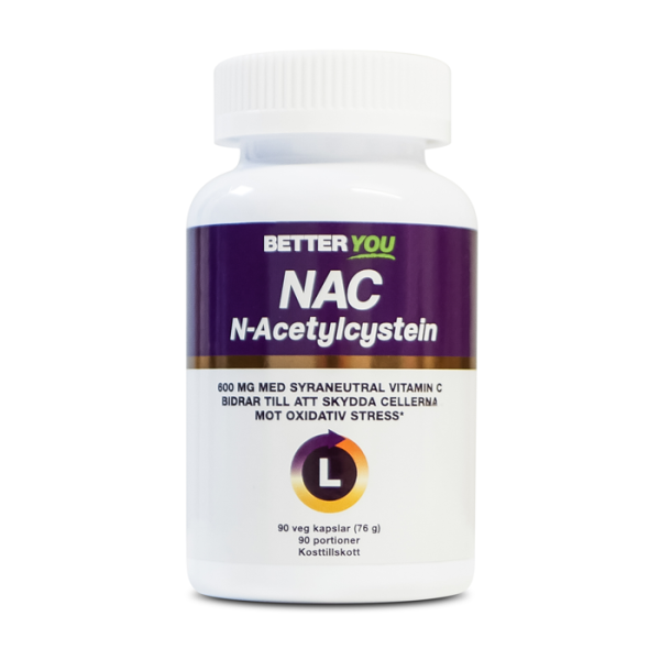NAC 90 kapslar, är ett kosttillskott från Better You med 600 mg N-Acetyl-L-Cystein per kapsel. Kompletterad med 80 mg syraneutral vitamin C.