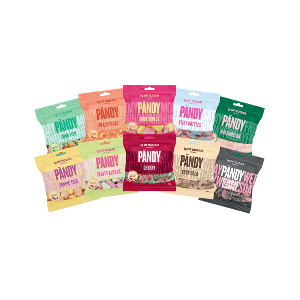 Välj fritt 10 Pändy-påsar och skapa din egen mix för helgmys, filmkväll eller present. Pändy gör godis utan tillsatt socker – den lilla mängd socker som syns i näringsdeklarationen kommer naturligt från stärkelse – och sötar i stället med erytritol, sukralos och acesulfam-K. Flera smaker innehåller mycket fiber (exempel: ca 70 kcal och ~26 g fiber per 50 g), vilket ger en lättare profil utan att tumma på smaken. Allt tillverkas i Sverige och är icke-GMO. ( Näringsvärden och ingredienser varierar per smak – se respektive produkt. ) Obs: Vissa smaker innehåller gelatin (ej veganska). Överkonsumtion av sockeralkoholer kan ha laxerande effekt. Se ingrediens- och allergiinformation per smak.