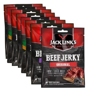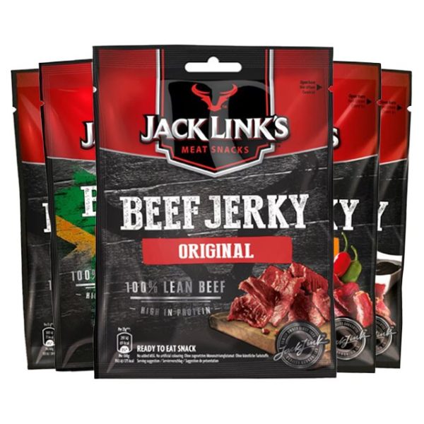 Välj fritt fem påsar bland populära smaker (t.ex. Original, Teriyaki, Biltong och Sweet Hot) och skapa din egen mix. Jack Link’s jerky tillverkas av 100 % nötkött som marineras och långsamt tillagas/röks över äkta trä för ett mört, smakrikt snack. Varje portion är rik på proteinoch relativt kalorisnål.Smidigt mellan möten, på resan eller efter träning. Återförslutningsbara påsar hjälper till att bevara fräschör och gör det enkelt att ta med. ( Näringsvärden och allergener varierar per smak – se etikett. ) Mixa och matcha dina favoritsmaker 100 % nötkött, hög proteinhalt per portion Långsamt rökt/tillagat för djup smak Återförslutningsbar förpackning – lätt att ta med och dela