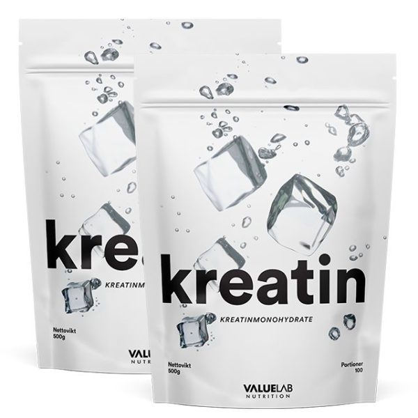 Superdeal! 2-pack Valuelab Kreatin till kanonpris Kreatin är idag ett av de mest populära kosttillskotten bland atleter världen över. Valuelab Kreatin är ett helt rent kreatinmonohydrat som endast innehåller mikroniserat kreatin. Kreatin från Valuelab är ett kreatin monohydrat pulver som används för att öka styrka, prestanda och uthållighet och har en neutral smak, som enkelt kan blandas ihop med andra prestationshöjande kosttillskott. Pre Workoutapos;er innehåller vanligtvis redan kreatin, men vissa personer har behovet av att öka kreatininnehållet och med Valuelab Kreatin kan du nu själv bestämma mängd kreatin i din pre-workout! Kreatinet kan självklart också tas precis som det är ihop med kallt vatten och kan ha förbättrande effekter för en snabbare återhämtning. Fördelar med Valuelab Kreatin Ökar styrka, fokus och explosivitet Kan blandas med andra prestationshöjare Endast 20 kalorier per portion Neutral smak Gör muskulaturen större Kreatin Monohydrat Pulver Varje portion av Valuelab kreatin innehåller 100% kreatin Monohydrat (5g) och är ett effektivt tillskott för dig som vill öka prestation, kraft och energi under fysisk aktivitet. Kreatin Monohydrat är ett kosttillskott som passar de flesta aktiva människor och är väl omtyckt i både fitness och idrottsvärlden på grund av dess effekter på explosivitet! Kreatin Monohydrat består av aminosyrorna metionin, arginin och glycin och med en daglig dos på 5g kan du snabbt uppnå ökad kraft, fokus och explosiv energi! Kreatin Monohydrat passar alla och är ett utmärkt kosttillskott att börja med om du inte använt kreatin tidigare. Kreatin har inte bara prestationshöjande och muskelbyggande effekter, utan kan även verka aktivt för att förminska återhämtningstid efter ett träningspass. Öka kreatinlagret Kreatin har en stor påverkan på muskelns naturliga, kemiska energi. Muskler innehåller naturligt en viss del kreatin och en komplettering av kreatin kan öka kreatinlagret med upp till 40%. Kreatin har länge används av både idrottsmän och i Bodybuilding, men har på senare tid blivit allt mer vanligt i allmänhet bland personer som tränar. Valuelab har här en enkel, snabb och effektiv kreatinprodukt, som passar så väl nybörjare som veteraner. Kreatinet är tillverkat, kvalitetskontrollerat och testat i Sverige. Ordprediktion Ordprediktion Ordprediktion