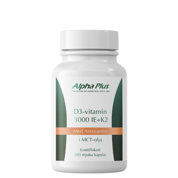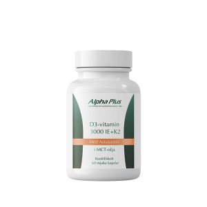 D3-vitamin 3000 IE från Alpha Plus är ett kosttillskott som kombinerar D3-vitamin, med K2-vitamin och astaxantin på ett effektivit sätt.