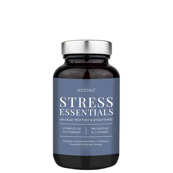 Stress Essentials är ett kosttillskott från Nordbo som kombinerar ett B-vitaminkomplex med syra-neutral vitamin C och magnesiumbisglycinat. Magnesium och vitamin C bidrar till att minska trötthet och utmattning.
