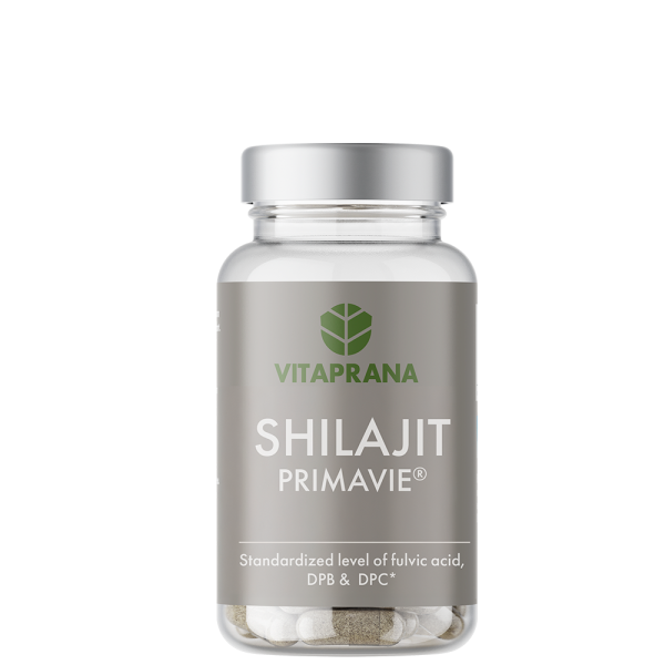 Shilajit PrimaVie® är ett kosttillskott från Vitaprana med standardiserat shilajitextrakt. Förpackningen innehåller 80 kapslar, tillräckligt för 40 dagars användning.
