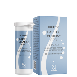 Holistic Lactovitalis®pro En balanserad mage är avgörande för hela kroppens välmående. Upp till 80 % av kroppens immunceller finns i tarmen, och när balansen mellan goda och mindre goda bakterier rubbas kan det påverka allt från matsmältning och energinivåer till humör, hud och motståndskraft. En mångsidig och stabil tarmflora är därför en av de viktigaste grundpelarna för god hälsa. Holistic Lactovitalis® pro är utvecklad för dig som vill stärka balansen inifrån med en avancerad mjölksyrabakterieprodukt baserad på vetenskap, kvalitet och omtanke. Bredspektrum av välstuderade mjölksyrabakterier Lactovitalis®pro innehåller minst 20 miljarder aktiva mjölksyrabakterier per kapsel, fördelade på 12 olika bakteriestammar. Stammarna är noggrant utvalda och väl dokumenterade i oberoende forskning, bland annat Lactobacillus rhamnosus och Lactobacillus reuteri – två av de mest studerade bakterierna inom tarmhälsa. Alla bakteriestammar ingår i Holistics eget Holistic Biome-koncept, där varje stam har ett unikt namn för Holistic men representerar välkända och vetenskapligt studerade bakterier. Detta säkerställer både spårbarhet, kvalitet och funktion. Fördelar medHolistic Lactovitalis®pro: ✓Innehåller 12 välstuderade stammar av mjölksyrabakterier ✓Levande bakterier hela vägen till tarmen – bevarade genom en avancerad framställningsprocess ✓Innehåller C-vitamin för immunsystemet och B2-vitamin för normala slemhinnor ✓Vegansk och utan onödiga tillsatser Avancerad CRYO-teknologi för maximalt upptag Mjölksyrabakterier är levande mikroorganismer och känsliga för värme, syre och magsyra. För att bakterierna ska överleva hela vägen till tarmen – där de gör verklig nytta – används Holistics avancerade CRYO-teknologi. Denna metod bevarar bakteriernas livskraft genom hela tillverkningsprocessen och matsmältningssystemet. Pulvret i kapseln fungerar som ett naturligt skydd för bakterierna, vilket gör att kapseln kan öppnas och innehållet blandas i mat eller dryck utan att bakteriernas aktivitet påverkas. Det gör produkten flexibel och enkel att använda även för personer som har svårt att svälja kapslar. Stödjande näringsämnen för tarm och immunförsvar Holistic Lactovitalis®pro innehåller även utvalda näringsämnen som kompletterar mjölksyrabakteriernas funktion: ✓ Vitamin C bidrar till immunsystemets normala funktion ✓ Vitamin B2 (riboflavin) bidrar till att bibehålla normala slemhinnor, inklusive tarmslemhinnan ✓ FOS (fruktooligosackarider) – en form av kostfiber som fungerar som näring för de gynnsamma bakterierna och bidrar till en god miljö i tarmen Denna kombination gör Lactovitalis® pro 3 till mer än ett probiotikatillskott – det är ett komplett stöd för tarmens ekosystem. Ren formulering och smart förpackning Produkten är helt vegansk, fri från onödiga tillsatser och utvecklad med högsta fokus på renhet och kvalitet. Den levereras i en specialdesignad burk med inbyggt torkmaterial, som skyddar innehållet mot fukt och syre och säkerställer bakteriernas kvalitet och stabilitet över tid. För dig som vill stärka hälsan inifrån Holistic Lactovitalis®pro är framtagen för dig som vill stödja en balanserad tarmflora, ett normalt fungerande immunsystem och ett långsiktigt välmående. Oavsett om du vill förbättra matsmältningen, stärka motståndskraften eller skapa bättre förutsättningar för kroppens inre balans, är detta ett genomtänkt och kraftfullt tillskott. Maghälsa Immunhälsa Vegansk