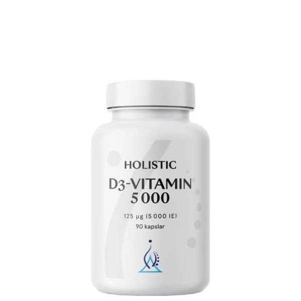 Holistic D3-vitamin 5000 Holistic D3-vitamin 5000 är ett högdoserat kosttillskott med vitamin D3 (kolekalciferol), utvecklat för dig som vill säkerställa ett optimalt intag av D-vitamin året runt. Vitamin D är ett av kroppens viktigaste vitaminer och spelar en avgörande roll för immunförsvar, skelett, muskler och allmänt välmående. I Norden är D-vitaminbrist vanligt, särskilt under höst och vinter då solljuset inte räcker till för kroppens egen produktion. Även personer som vistas lite i solen, använder solskydd, är äldre eller har ökat behov kan ha svårt att nå tillräckliga nivåer via kost och sol. Holistic D3-vitamin 5000 är därför ett kraftfullt och pålitligt alternativ för dagligt tillskott. D3 – den mest effektiva formen av D-vitamin Holistic D3-vitamin 5000 innehåller vitamin D3, den form som kroppen själv producerar vid solexponering och som har bäst biotillgänglighet. Det innebär att kroppen effektivt kan ta upp och använda vitaminet för sina viktiga funktioner. Stöd för immunförsvar, muskler och skelett Vitamin D bidrar till: ✓Immunsystemets normala funktion ✓Att bibehålla normal benstomme och normala tänder ✓Normal muskelfunktion ✓Normala kalciumnivåer i blodet D-vitamin spelar även en viktig roll i celldelningsprocessen och är avgörande för kroppens upptag och omsättning av kalcium, vilket gör det centralt för långsiktig benhälsa. Anpassad för ökat behov Med 5000 IE (125 µg) vitamin D3 per kapsel är Holistic D3-vitamin 5000 särskilt anpassad för dig med ökat behov, till exempel vid konstaterad brist, under vinterhalvåret eller vid hög fysisk belastning. Produkten är enkel att dosera och passar bra som del av en daglig hälsorutin. Ren formulering med fokus på kvalitet Holistic D3-vitamin 5000 är framtagen med fokus på kvalitet, renhet och funktion, utan onödiga tillsatser. Ett genomtänkt val för dig som vill ge kroppen ett effektivt och tillförlitligt D-vitamintillskott. Ett viktigt tillskott för immunförsvar, styrka och välmående – året runt. Leder/Muskler/Skelett Immunhälsa Vegetarisk