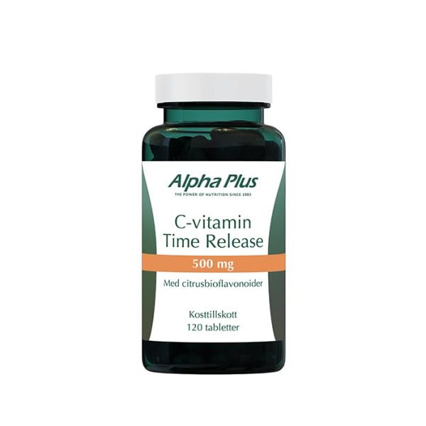Alpha Plus C-vitamin Time Release är ett kosttillskott med 120 tabletter som innehåller 500 mg C-vitamin per tablett, utformad med time release-teknologi för långsam frisättning.