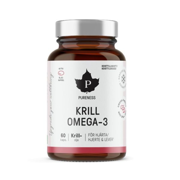 Pureness Krill Omega-3 Pureness Krill Omega-3 är ett premium kosttillskott med högkvalitativ krillolja i fosfolipidform, utvecklat för optimal upptagning och effektivt näringsstöd. Omega-3-fettsyrorna EPA och DHA bidrar till hjärtats normala funktion, och den gynnsamma effekten uppnås vid ett dagligt intag av 250 mg EPA och DHA. Överlägsen absorption med fosfolipidbunden omega-3 Till skillnad från traditionell fiskolja är omega-3 i krillolja bundet till fosfolipider, vilket kan förbättra kroppens upptagningsförmåga och biotillgänglighet. Det gör Pureness Krill Omega-3 till ett effektivt alternativ för dig som vill maximera nyttan av dina essentiella fettsyror. Berikad med kolin och astaxantin Formulan innehåller naturligt förekommande näringsämnen som förstärker produktens hälsofördelar: ✔Kolin – en vitaminliknande förening som bidrar till normal leverfunktion och fettmetabolism ✔Astaxantin – en kraftfull karotenoidantioxidant som ger kapslarna deras naturligt röda färg Hållbar och ren råvara från Antarktis Krilloljan utvinns från några av världens renaste havsvatten kring Antarktis. Den skonsamma Eco-Harvesting-metoden minimerar bifångst och skyddar marina ekosystem, vilket gör produkten till ett hållbart val. Lätt att ta – utan eftersmak De mjuka kapslarna är lätta att svälja och orsakar varken fiskig eftersmak eller halsbränna, vilket gör tillskottet behagligt att använda dagligen. Fördelar med Pureness Krill Omega-3 ✔Omega-3 (EPA DHA) för hjärtats normala funktion ✔ Fosfolipidform för bättre upptag ✔ Med kolin för lever och fettmetabolism ✔ Innehåller naturligt astaxantin ✔ Hållbart fångad krillolja från Antarktis ✔ Ingen fiskig eftersmak
