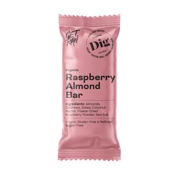 DIG Raspberry Almond Bar 42g hittar du i Hälsokost - Livsmedel - Snack & Godis.